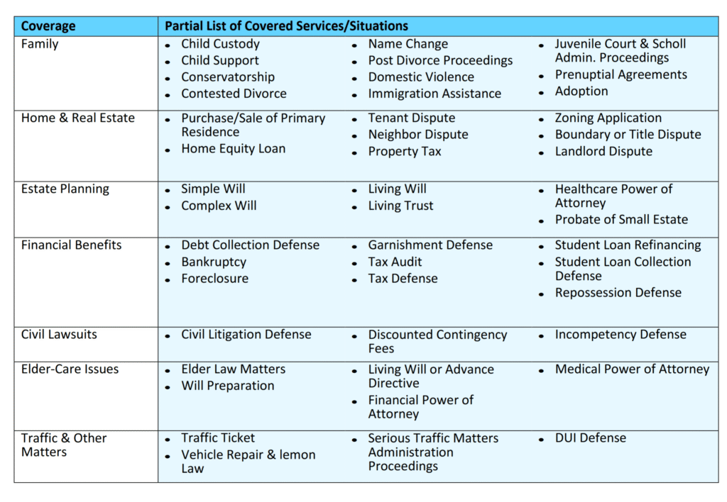 The plan covers the Associate and all family members at one monthly rate of $20.45. Telephone and office consultations are available for an unlimited number of personal legal matters with an attorney of their choice. For non-covered matters that are not otherwise excluded, this benefit provides four (4) hours of network attorney time and services per year.